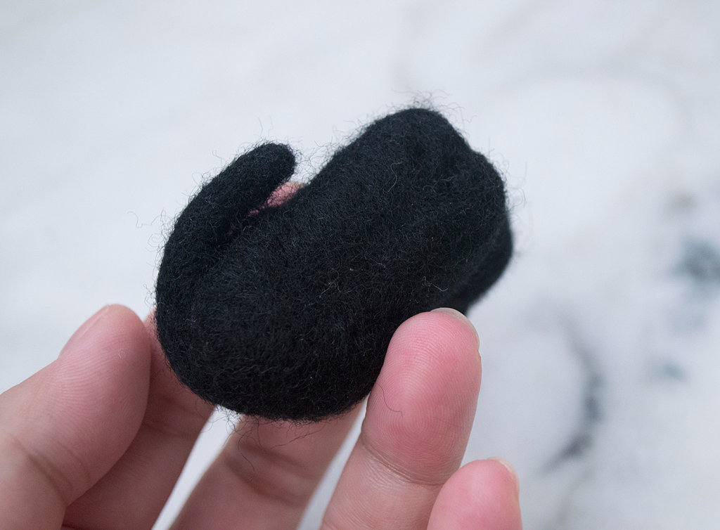 Take some more roving, enough to make two lima-bean-size hind legs. Use the speed needle to carefully felt each strip of fiber into two rounds. Take another two bits of roving to make two triangular black ears.